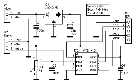 Software für ATtiny13 mit Quelltext in Assembler vom 23.05.2008 | servo-v100.zip |